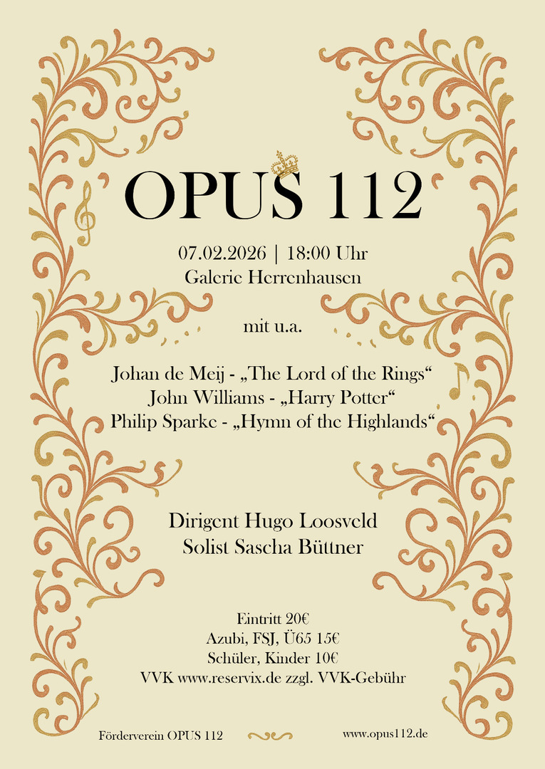Über 70 Musikerinnen und Musiker unterschiedlichster Berufe und Altersgruppen eint eine große gemeinsame Leidenschaft: das Musizieren auf höchstem Niveau. Mit Engagement, Präzision und Herzblut bringt OPUS112 seit Jahren anspruchsvolle Musik auf die Bühne – und das mit beachtlichem Erfolg. Ob bei offiziellen Anlässen der Feuerwehr Hannover, der Stadt Hannover oder des Landes Niedersachsen – auch international – gestaltet OPUS112 oft das musikalische Rahmenprogramm und begeistert dabei ein breites Publikum.